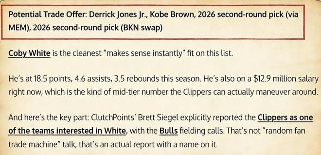 美媒《Fadeaway World》撰文建议,快船可以将小琼斯、科比·布朗、2026年的次轮签(来自灰熊)、2026年的次轮签(篮网互换)打包送到公牛,换回后卫科比·怀特。
