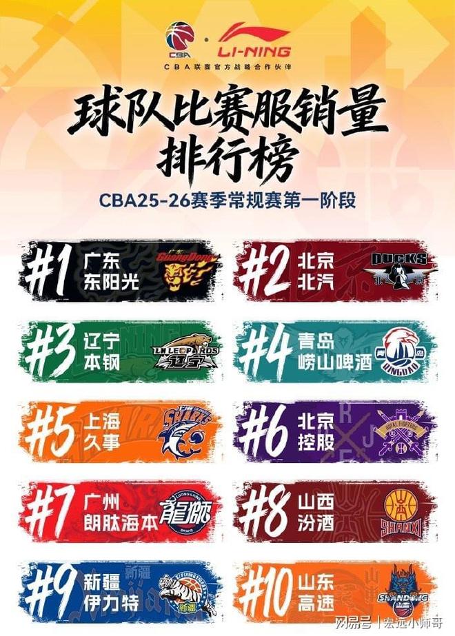 而球队球衣前十排名依次是:广东,北京,辽宁,青岛,上海,北控,广州,山西,新疆和山东。
