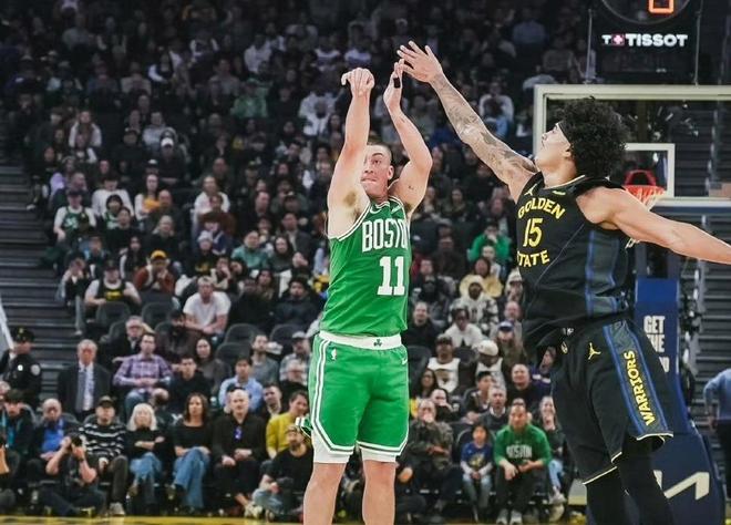 本场比赛,双方在首发阵容上面,勇士这边派出的是,梅尔顿,穆迪,追梦格林,斯潘塞和桑托斯。库里因为右膝盖伤势遭遇重创,将至少缺席此后5场比赛。凯尔特人这边派出的是,布朗,怀特,克塔,豪瑟,贝勒。首节比赛开始,勇士率先拿到球权,穆迪借助掩护三分手起刀落,打进本场比赛首个进球,梅尔顿屁股一撅,扭腰上篮轻松得手,布朗底角漂移反身上篮为绿军开张,豪瑟横移一步的超远三分开火一击命中,斯潘塞大空位三分发炮同样也有,贝勒顶着防守强投三分球正入网心,怀特小手一抖,优雅挑篮稳稳命中,理查德的中距离干拔也正入网心。