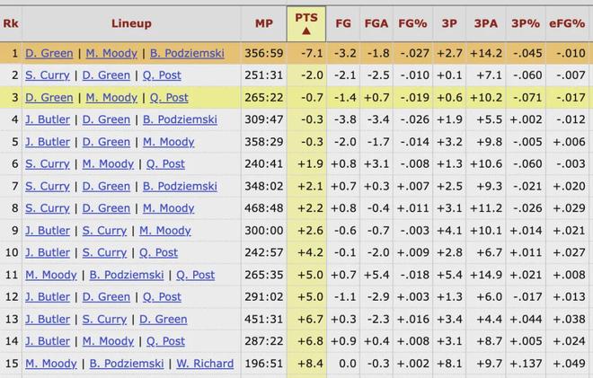 在勇士三人组中,追梦、波杰、穆迪的组合一起出战将近357分钟,这一时长排名队内第四(前三的三人组中至少有库里和巴特勒其中一人),但三人同时在场时,勇士每百回合要净负7.1分,在队内断层式垫底。