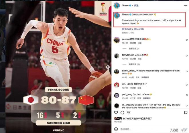 更离谱的是,FIBA世界杯的官方账号赛后竟然写道:“冲绳神剧本!中国男篮从日本偷走一场胜利。”(China with a sneaky win over Japan),“Sneaky”一词隐含“鬼祟、卑鄙”的贬义,被质疑暗指中国队胜之不武。